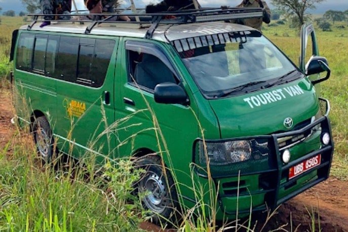 De groene en beige minivans die je vaak in Oeganda ziet, zijn speciaal omgebouwde Toyota Hiace safari vans. Ze behoren tot de populairste voertuigen voor rondreizen en korte safari’s.